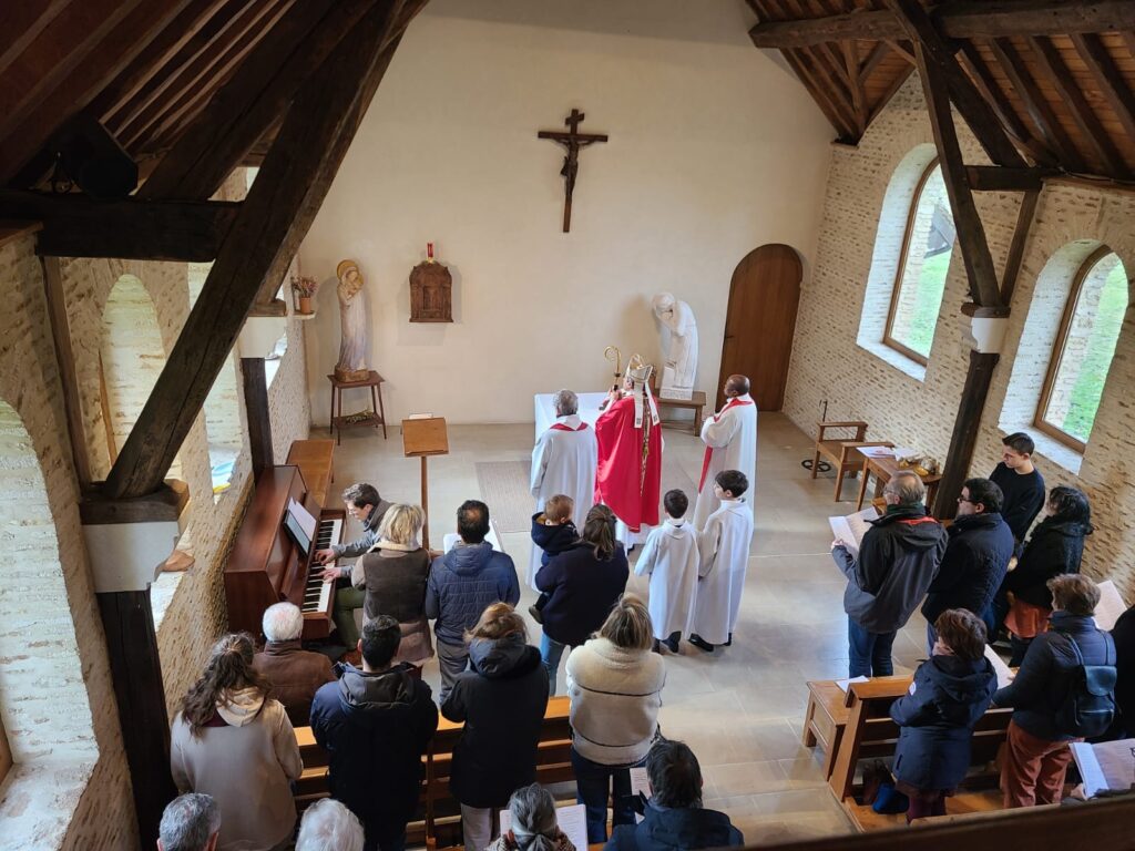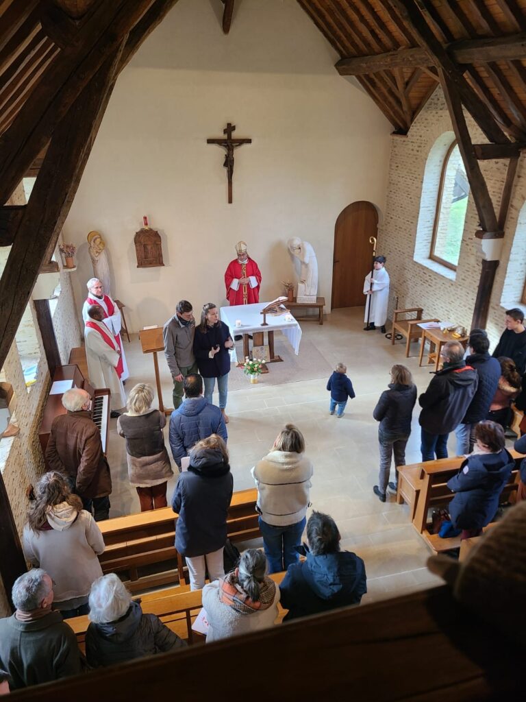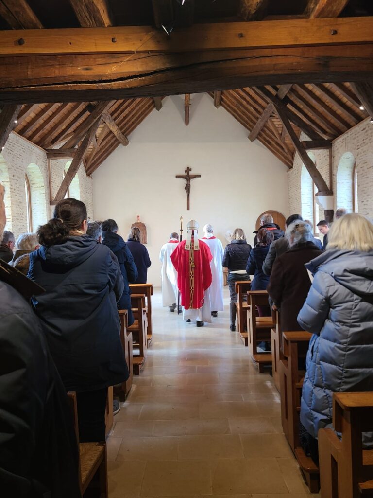 Monseigneur de Cagny arrive de bonne heure au Pressoir, c’est lui va célébrer la messe. Il prend d’abord un temps d’échange avec nos frères et soeurs accueillis à la maison. Puis, au compte goute, les autres heureux invités aux repas des noces de l’Agneau, passent les portes de la maison. Ils sont tous bien emmitouflés : les températures sont négatives en ce moment à Croisy et le chauffage de la chapelle est en panne. Alors on se serre, les uns contre les autres, fraternellement. Nous sommes plus d’une centaine dans la petite chapelle lorsque la cloche retentit et que Romain entonne le chant d’entrée.