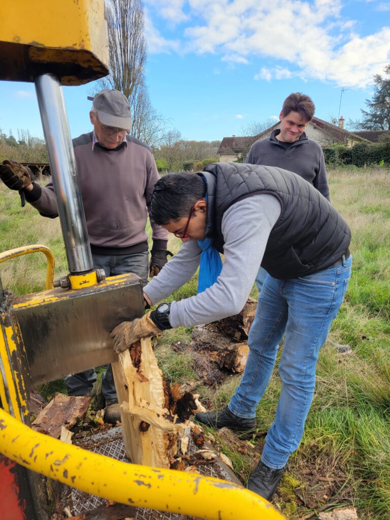 18 novembre 2025 : Grâce à notre ami agriculteur, activité « fendage » (troncs de nos peupliers)